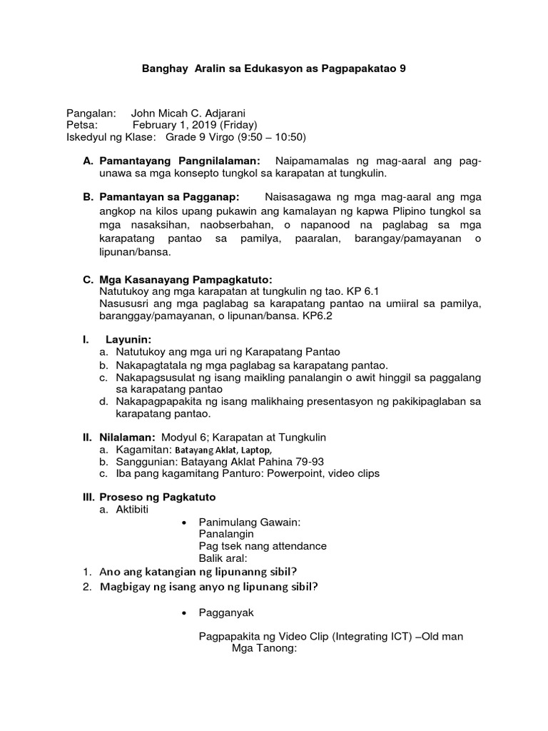 Banghay Aralin Tungkol Sa Karapatang Pantao. Pagpapahalaga ano ang kahalagahan ng paksang tinalakay mahalagang nalaman at natutunan naming natin ngayon. Wala po dahil parehong karapatang pang tao ( magkakaroon ng malayang talakayan ang hinihingi nilang mangyari sa ating bansa.