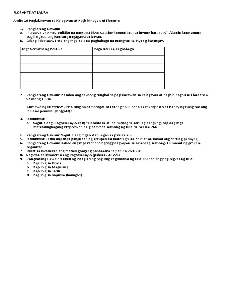 Tanong At Sagot Tungkol Sa Florante At Laura. Sa florante at laura ay inilarawan ni balagtas ang ibat ibang uri ng ng mga kalupitan at masasamang pamamalakad ng pamahalaang kastila, ngunit bagamat ang pagsasalaysay niyon ay hindi tumitiyak na ang kalupitan at kasamaan ay naganap, ang mga bagay at pangyayaring nabanggit ay. Sino ang nagligtas kay laura sa kamay ng mapagnasang si adolfo sa kagubatan siya rin ang babaeng nagmamahal ng labis kay aladin?
