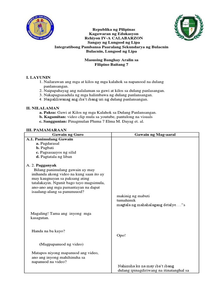Masusing Banghay Aralin Sa Dula Dulaan from image.slidesharecdn.com Nakakapagbigay ng ideya tungkol sa usaping pantahanan at pampaaralan. Banghay aralin sa filipino grado 7 unang markahan aralin 1.6 (pangwakas na gawain) panitikan: Isang guhit o isang pangkat ng mga guhit na tumutukoy sa hugis ng isang bagay, lalo na sa paggawâ ng krokis o dayagram.