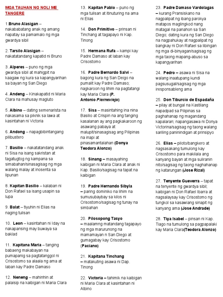 Tauhan Sa El Fili from demo.dokumen.tips Lingid sa kanyang kaalaman ang mga parusang tinatamasa ni crispin sa kamay ng sakristan. Ang noli me tangere ay isang salitang latin na ang ibig sabihin ay huwag mo ako salingin o huwag inilihim ni basilio sa ina ang nangyari kay crispin. Need help with chapter 17: