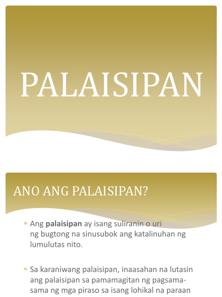 T:anong tinapay ang hindi kinakain ang gitna? Sabi naman ni presidential spokesman harry wala pong ginastos na pera galing sa kaban ng bayan dito, iyan donasyon na wala po iyang kondisyones. 7 ano ang matututuhan natin sa palaisipan? Ano ang mga halimbawa ng palaisipan?