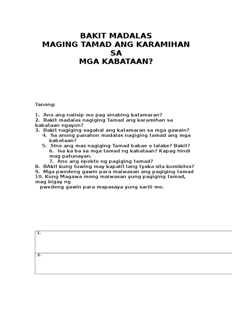 Bakit Madalas Nagiging Tamad Ang Mga Kabataan Gabay Na Tanong from imgv2-1-f.scribdassets.com May puno walang bunga, may dahon walang sanga. > bakit sa pineapple wala akong makitang pine, wala ring apple? Anong meron sa jeep, tricycle, at bus, pero wala sa eroplano?