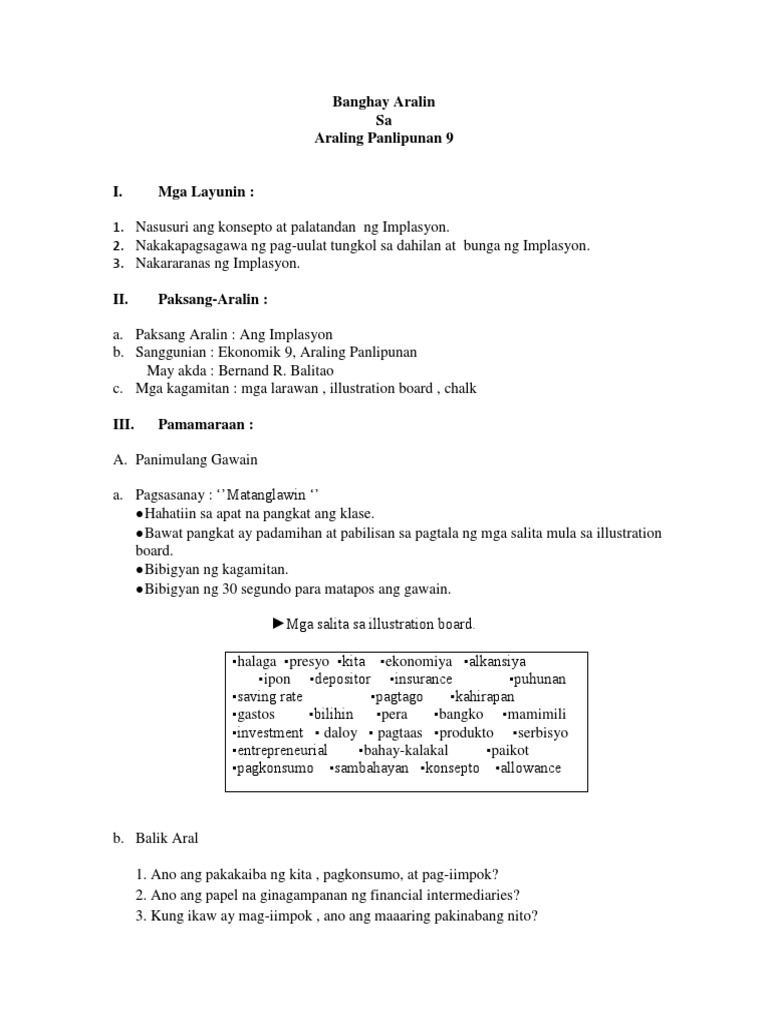 Banghay Aralin Tungkol Sa Implasyon. Nailalahad ang mga nagiging dahilan ng pagkakaroon ng implasyon at ang mga epektong dulot nito. Mga hakbang at panuntunan sa pagsasagawa ng makatotohanang proyektong panturismo inaasahang pagganap:
