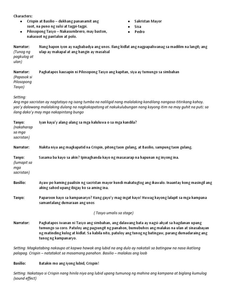 Ang original kasi na kabanata ng noli ay 64. Gosh this is driving me nuts!, my groupmates decided that i would be the scriptwriter for noli me tangere since i couldnt speak tagalog much, but they didnt know that i cant read tagalog that much either, and now i have to do this paperwork and its due on monday, argh! Nakikita siya ng mga maykapangyarihan bilang isang mabuting tao, nagtataglay ng mabuting kalooban, payapa, mapagkumbaba, masunurin, hindi nagbabasa ng anumang aklat o mga dyaryo mula sa espanya. Script ng noli me tangere script kabanata 50 hanggang katapusan.