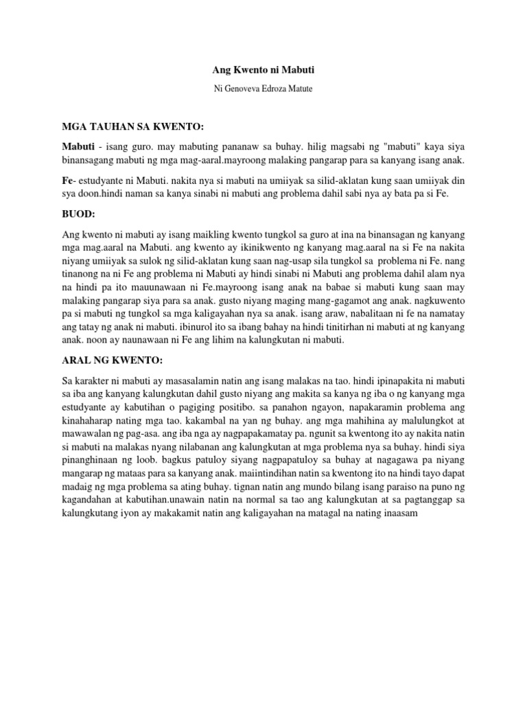 Magbibigay ba ng shs ang aking eskwelahan? Ang tauhan na lapad ay isang karakter sa kwento na hindi nagababago ang kanyang ugali hanggang sa huli ng kwento samantalang ang tauhan na bilog ay kabaligtaran ng. Ang kwento ni mabuti ni genoveva edroza matute. Bukod sa pagiging magalang, masipag, mapagkumbaba ay mabuting makisama sa mga taga nayon si iskong salamangkero.