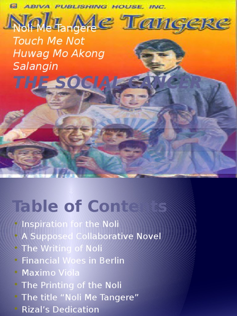 Ang pagsusulat ng noli me tangere ay bunga ng pagbasa ni rizal sa uncle tom's cabin ni harriet beacher stowe, na pumapaksa sa ang pamagat ng noli me tangere ay salitang latin na ang ibig sabihin sa tagalog ay huwag mo akong salingin na hango sa ebanghelyo ni san juan bautista.