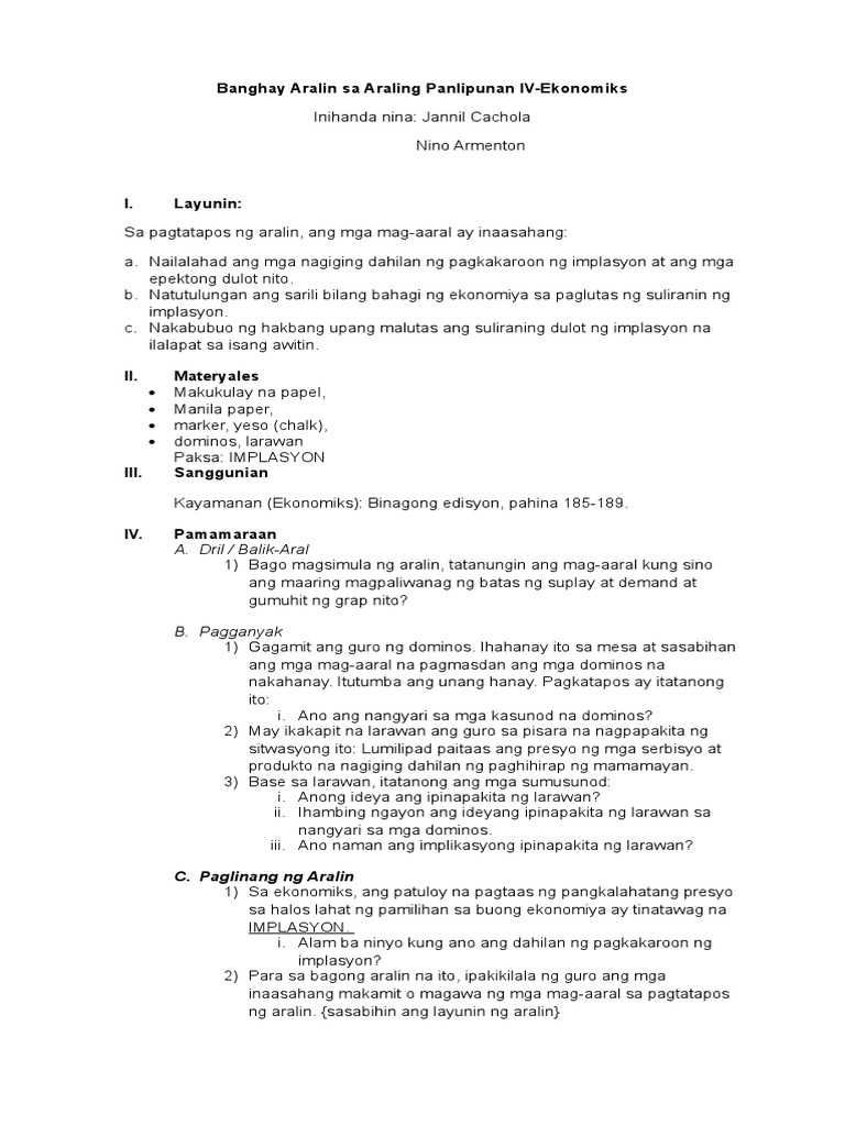 Banghay Aralin Tungkol Sa Implasyon. Mga hakbang at panuntunan sa pagsasagawa ng makatotohanang proyektong panturismo inaasahang pagganap: C.analisis matapos nating matukoy ang iyong inisyal na kaalaman tungkol sa konsepto ng demand, ating pang mas palawakin ang inyong kaalaman tungkol sa batas ng demand.