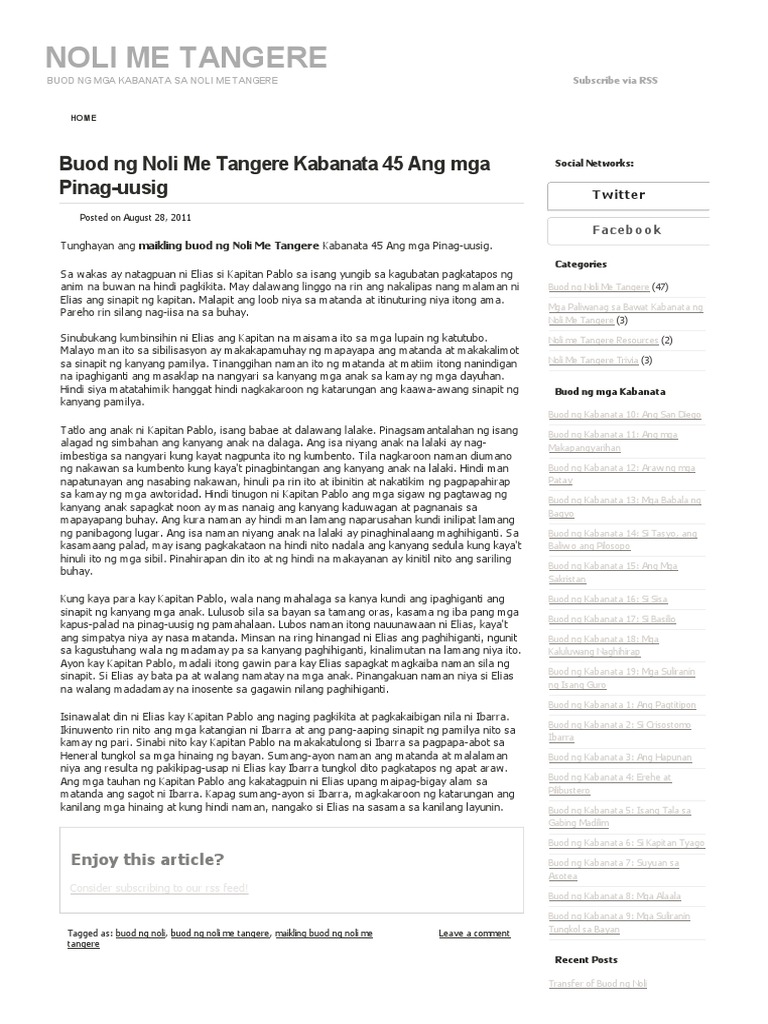 Lahat ng lihim ay nabubunyag at walang 'di nagkakamit ng parusa. Noli me tangere buod kabanata 3: Nakatakdang ganapin sa gabing iyon ang marangyang handaan sa tahanan ni don santiago delos santos o mas kilala bilang si kapitan tiyago. Panauhin ni ibarra si elias.