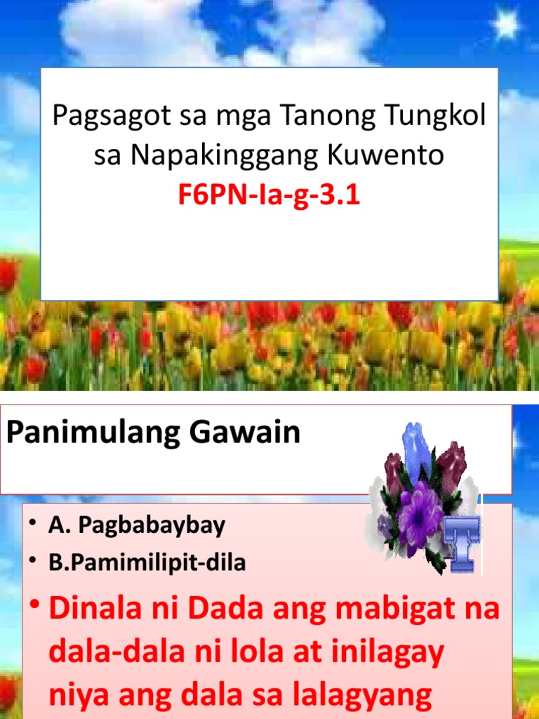 Pagsagot Sa Mga Tanong Tungkol Sa Napakinggang Kuwento. Sa ating pagsagot sa mga. Nasasaulo ang isang tula awit na napakinggan at naisasadula ang isang isyu o paksa mula sa tekstong napakinggan.