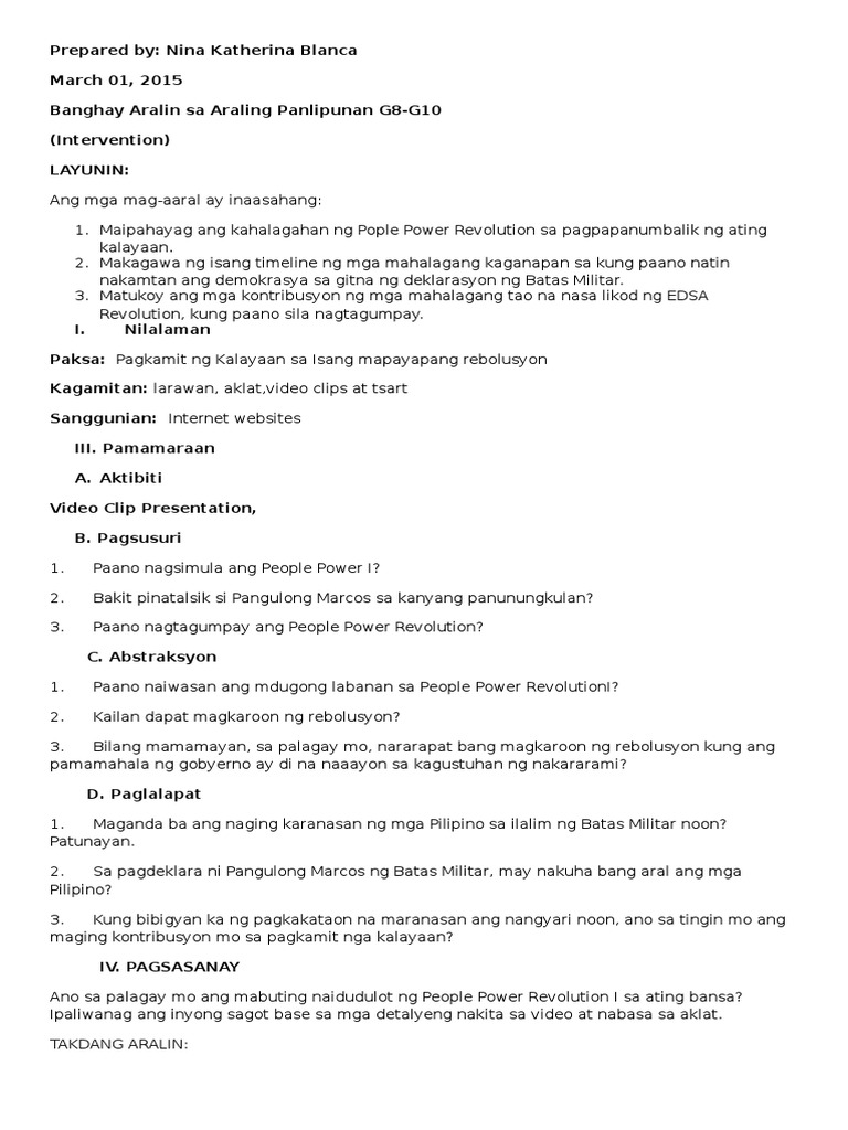 Banghay Aralin Tungkol Sa Edsa Revolution. Ang banghay aralin na ito ay binubuo ng mga aralin tungkol sa mga uri ng teksto. Published september 24, 2012 by iamafutureteacher.