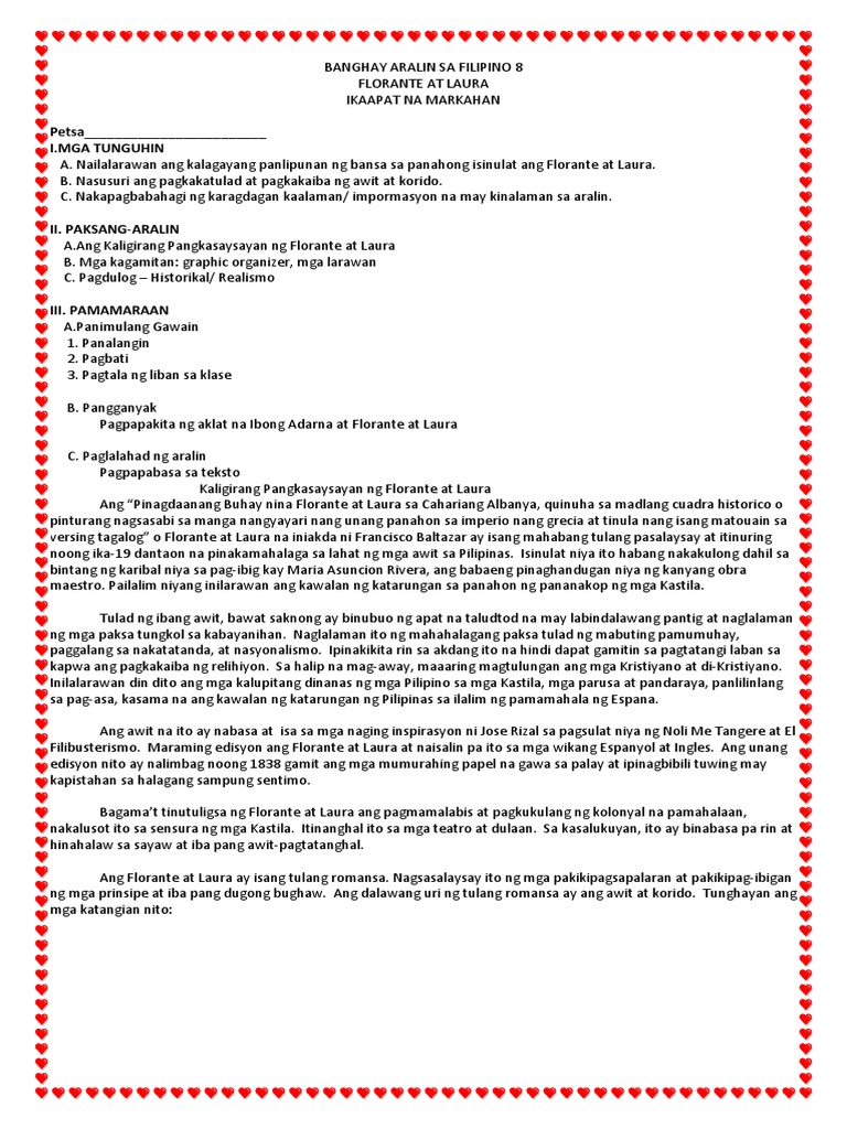 Florante At Laura Docx Pangalan Seksyon Ibigay Ang Hinihingi Ng Bawat Aytem Ilagay Ang Inyong Sagot Sa Espasyo Bago Ang Bilang I A Isulat Ang T Kung Course Hero from www.coursehero.com Florante at laura is the tale of the love and determination of duke florante and the princess laura of abania whilst they are pursued by the count adolfo. (naimbitahan si florante sa palasyo ng hari kung saan nabighani siya sa pagkakakita kay laura anak ng hari ng albanya) 31.sila ang humingi ng tulong (sabungan) 58 ano ang itinatahi ni laura para hindi masugatan si florante sa pakikipagdigma? Siya ang mortal na kaaway ni florante, ang.
