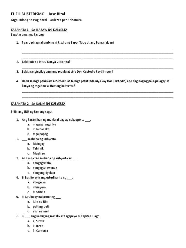 El Filibusterismo Kabanata 4 Tanong At Sagot. Bakit nais na ni placido na huminto sa pag aaral? Kabesang tales from the story el filibusterismo (buod/pahiwatig ng bawat kabanata) by parsafall with 34,083 reads ibinayad ng ketongin kay basilio ang agnos at ito naman ay inihandog ni basilio kay huli.