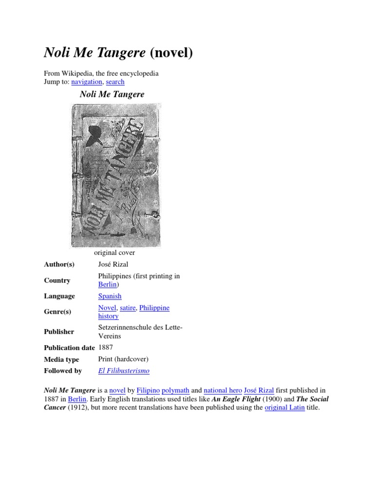 Noli me tangere, jose rizal's first novel, conveys various themes that circle on social cancer. with an aim of promoting awareness among noli me tangere, the first novel written by the philippine's national hero jose rizal, mirrors its creator's persistence in attaining freedom from the spaniards.