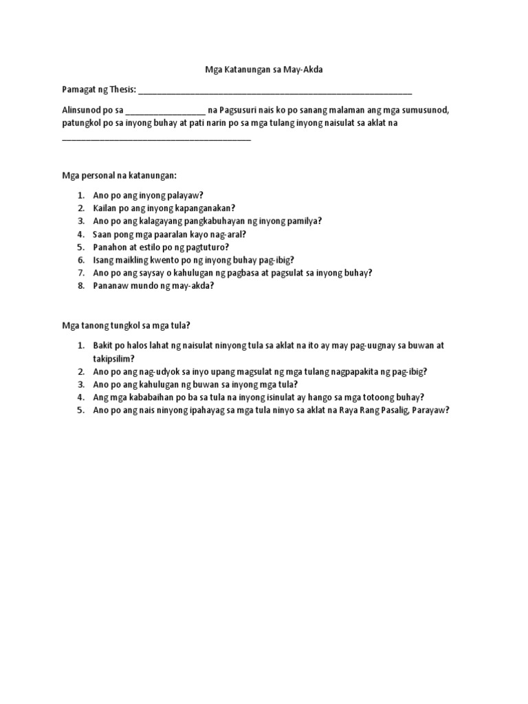 Mga Tanong Sa Pananaliksik Tungkol Sa Wika. Kahalagahan ng akdang pampanitikan sa aspetong kultural ng mga pilipino isang pananaliksik na iniharap kay ginoong alfredo l. Kaugnay nito, ang halimbawa ng tanong na maaaring talakayin para sa dagliang talumpati sa buwan ng wika 2018 ay ito: