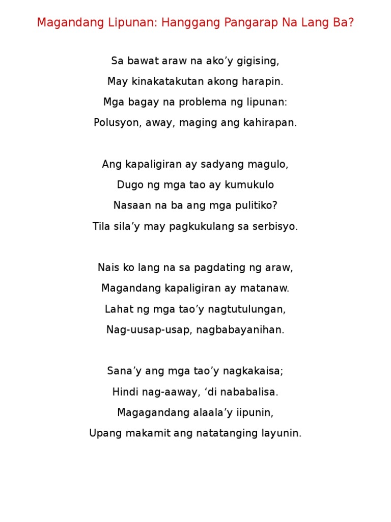 Tula Tungkol Sa Asignaturang Araling Panlipunan. Matutong magtrabaho at kumilos ng nasa ayos. Korapsyon, katiwalian, krimen at kaguluhan.
