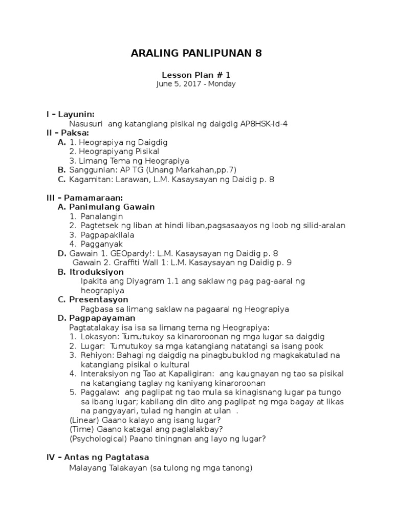 Ang katagang heograpiya ay hango sa salitang greek ang heograpiya ay ang aral tungkol sa mundo: Ang heograpiya ay isang paksang may napakalawak na saklaw. Banghay aralin sa araling panlipunan 8 mp3 & mp4. Sagutan ang aktibiti sa pahina 340.