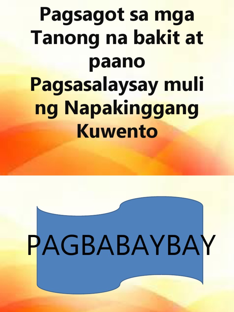 Pagsagot Sa Mga Tanong Tungkol Sa Napakinggang Kuwento. Sa ating pagsagot sa mga. Nasasaulo ang isang tula awit na napakinggan at naisasadula ang isang isyu o paksa mula sa tekstong napakinggan.